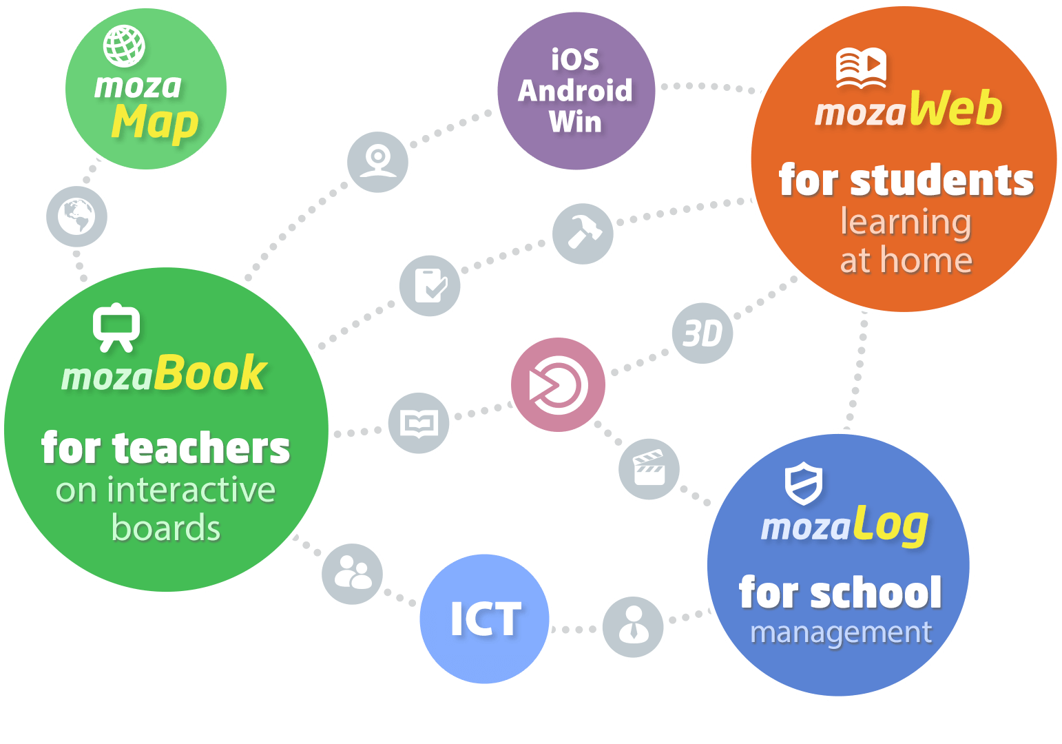 สื่อ 3D แบบอินเทอร์แอคทีฟ (เชิงโต้ตอบ) มากกว่า 1200 เรื่อง, วิดีโอเพื่อการศึกษาหลายร้อยรายการ, การพัฒนาทักษะในตัว, แอปพลิเคชั่นและเกมที่มีภาพประกอบและเสมือนจริงในห้องปฏิบัติการ, ทั้งหมดนี้มีพร้อมใช้งานในซอฟต์แวร์ mozaBook และบน mozaWeb อ่านเพิ่มเติม